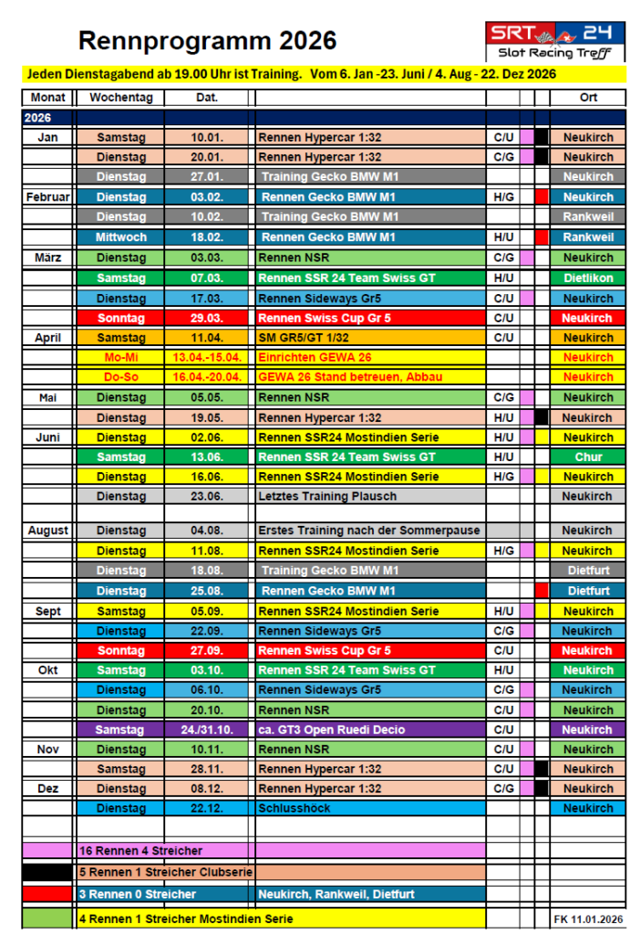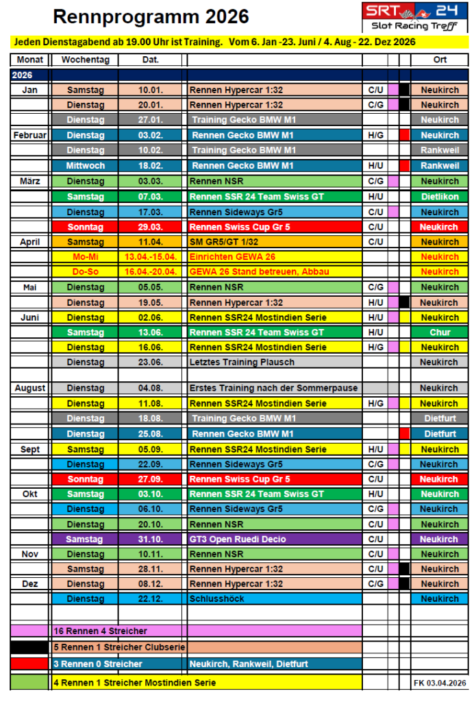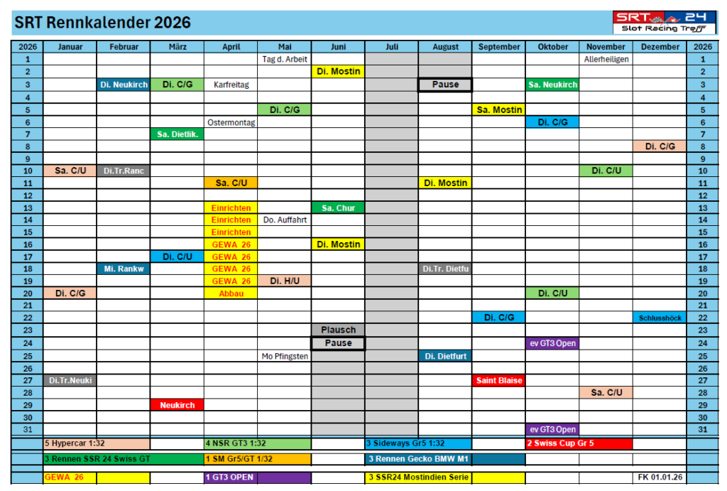 Nachfolgend findet ihr unsere Saison 2026 in zwei Ansichten. 1x aufgelistet und 1x als Rennkalender.